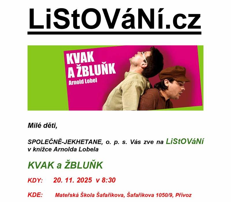 Milé děti, SPOLEČNĚ-JEKHETANE, o. p. s. Vás zve na LiStOVáNí v knížce Arnolda Lobela KVAK a ŽBLUŇK KDY: 20. 11. 2025 v 8:30 KDE: Mateřská Škola Šafaříkova, Šafaříkova 1050/9, Přívoz TĚŠÍME SE NA VÁS! LiStOVáNí.cz: Kvak a Žbluňk (Arnold Lobel) Zelený žabák Kvak a hnědý ropušák Žbluňk jsou velcí kamarádi a jeden bez druhého neudělá krok. I jejich přátelství však někdy zastíní mráček. To když je Kvak až příliš podnikavý a vymýšlí si výlety, které pohodlného Žbluňka stojí velké přemáhání. Přesto se na sebe dlouho nezlobí a hned se pouštějí do dalších společných dobrodružství. Prolínání fantazie s realitou umocňuje kouzlo této knížky. Příběhy, které by nás mohly vyučovat chápat a žít, navazují v LiStOVáNí jako další část ze série tzv. večerníčků naživo. - účinkují: Lukáš Hejlík, Alan Novotný - v překladu Evy Musilové vydalo nakladatelství Albatros
